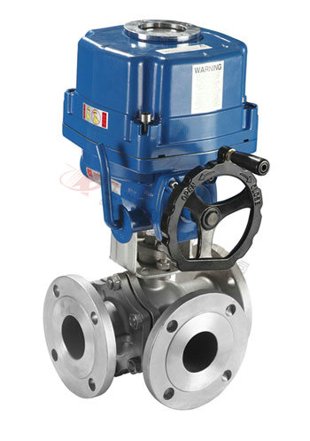 电动三通球阀分L型和T型,介质流通方向见下图。L型电动三通球阀适用于介质流向的切换,能使相互垂直的两个通道连通:T型电动三通球阀适用于介质的分流、合流或流向 切换,T型孔道可以使三个通道互相连通或使其中两个通道连通,电动三通球阀一般采用三个阀座结构,亦可根据用户要求采用四阀座结构。