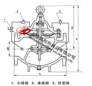 600X水力电动控制阀当阀门从进口端给水时,水流经过针阀进入主阀控制室,当电磁导阀打开时,控制室内的水经电磁导阀打开,球阀流出。球阀开度大于针阀开度,主阀控制室压力很低,主阀处于全开状态。