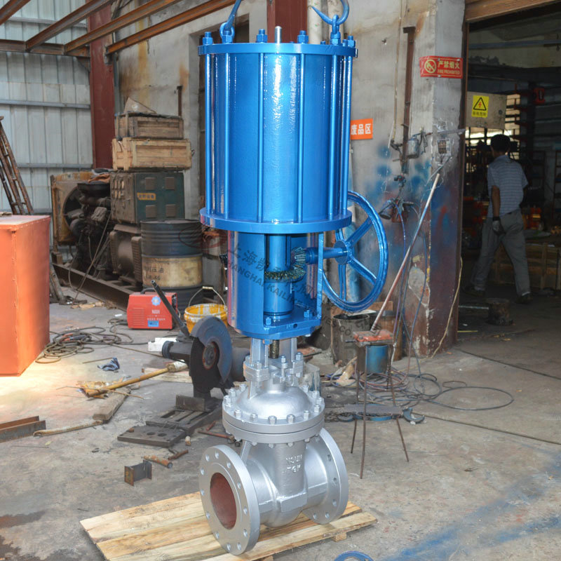 4、气缸盖上部装有气动-手动转换装置。将转换手柄顺时针方向提转到“气动”定位孔定位,闸阀处于气动操作状态;反之,将转换手柄逆时针方向提转到“手动”定于孔处定位,闸阀即可进行手动操作。带锥齿轮的手柄转换方向相反。 手动操作闸阀时,手轮旋向和普通手动阀一样,即顺时针转为关,逆时针转为开。带锥齿轮转动的相反。